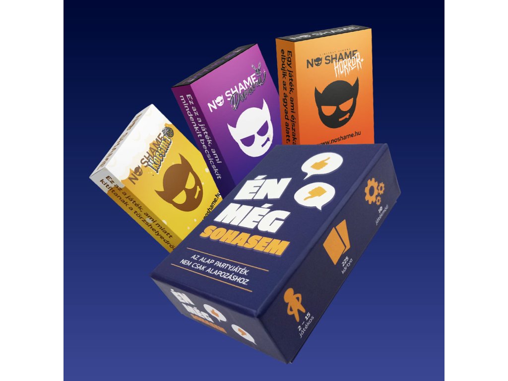 Ez a csomag nem ismer kompromisszumot! Miért választanál egyet, ha a tiéd lehet az összes? A Full Extra csomaggal megkapod a teljes repertoárunkat: a klasszikus Én Még Sohasem alapjátékot, mellé pedig a teljes No Shame trilógiát (Kocsma, Horror, Domina).